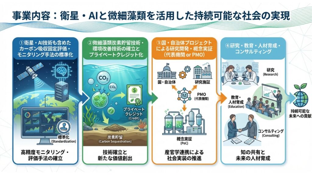 - 水圏光合成生物によるCO₂ 隔離効果の解明と、人為的介在による水圏光合成生物を活用したCO₂ 隔離手法の社会実装