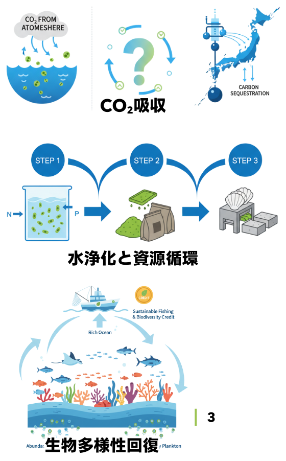 ① CO₂吸収: 微細藻類は地球全体で90GtのCO₂を吸収するが、適切な評価方法と人為的介在手法が未確立